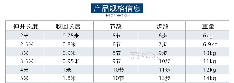 伸態(tài)2.5m, 縮態(tài)0.80m, 6節(jié), 7步;